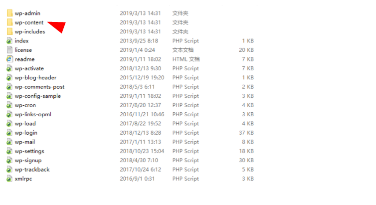 所以就要先下载Wordpress最新版解压,得到下面文件。然后把文件包里的wp-content文件夹删掉,把剩下的文件在FTP上传替换,升级网站文件。(网站根目录的wp-content注意别被替换了)