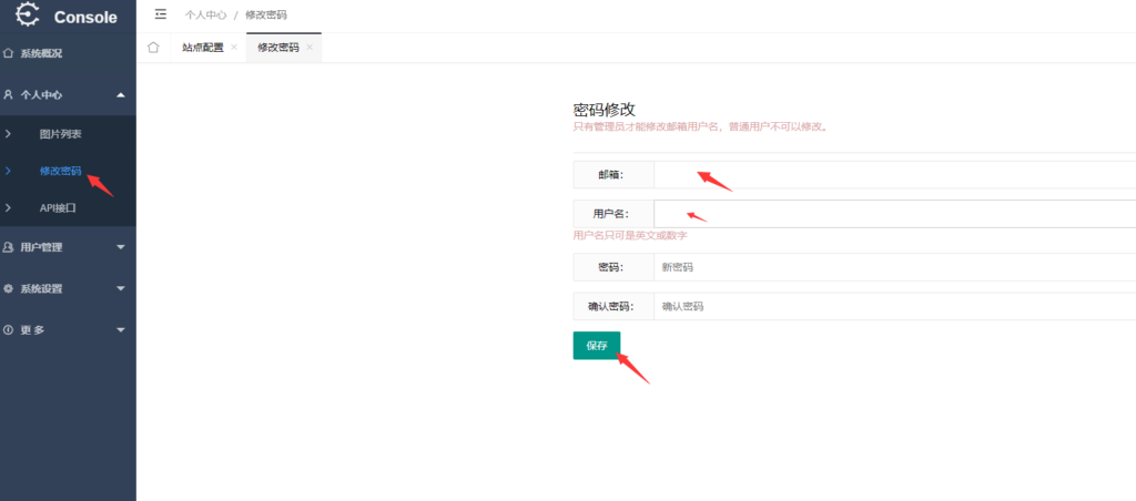 1.2 个人中心-修改密码(填写你的邮箱,新的管理员账号名称和密码)