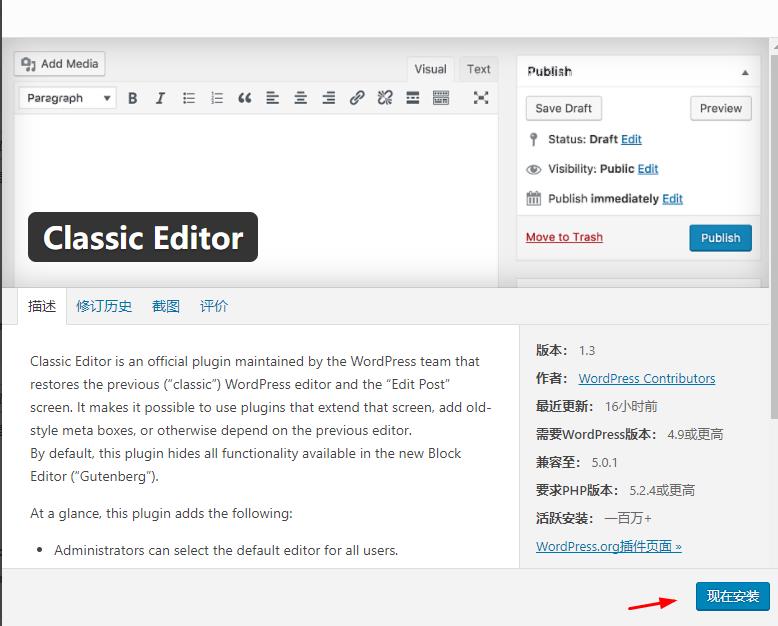 2、搜索Disable Gutenberg插件,直接安装启用,